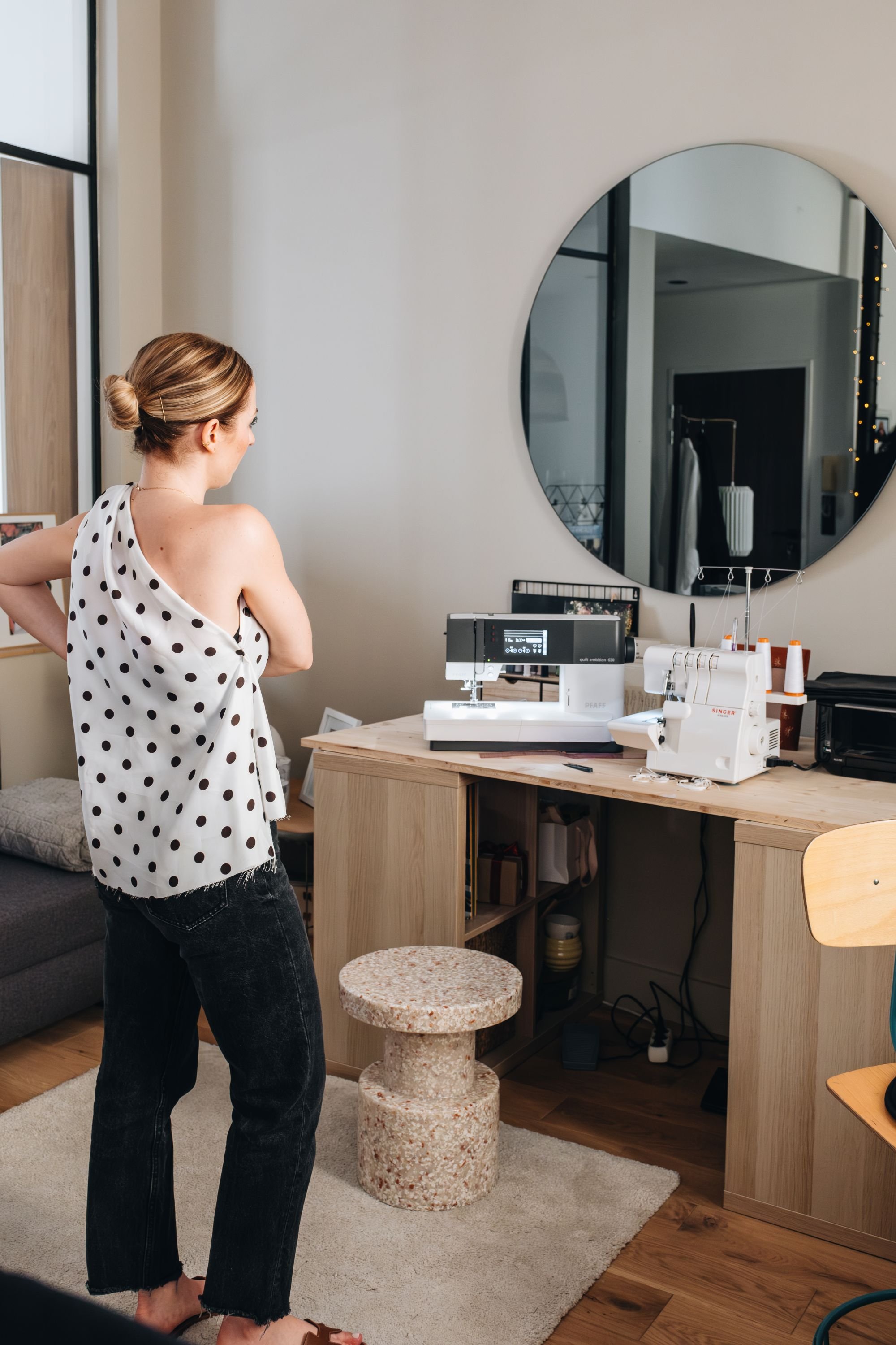 Je mets en place des modèles en édition limitée, réalisés grâce à l’upcycling de tissus de grandes maisons de couture inutilisés.